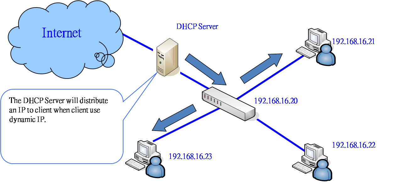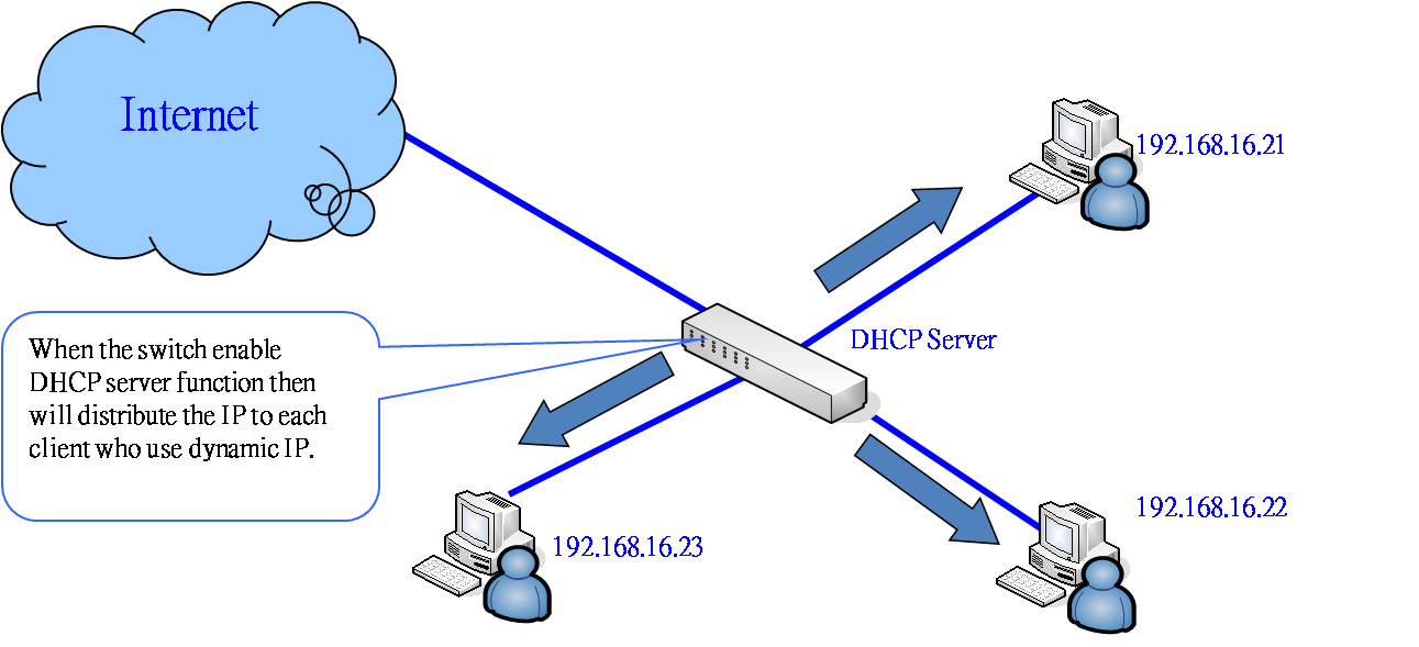 There’re two roles in DHCP protocol: server and client. Switches may support only DHCP client or both DHCP server and client. When DHCP client function is enabled, the switch will be assigned an IP address from the network DHCP server. The default IP address will be replaced by the assigned IP address on DHCP server. When the switch supports DHCP server and the function is active, the system will collect the DHCP client information dynamically. Once a device is connecting to the port and asks for IP assigning, the DHCP server will assign the IP address from the range that set by administrator. The central database that DHCP server provides can prevent two computers from being configured with the same IP accidently.