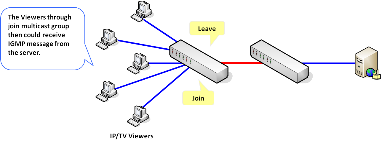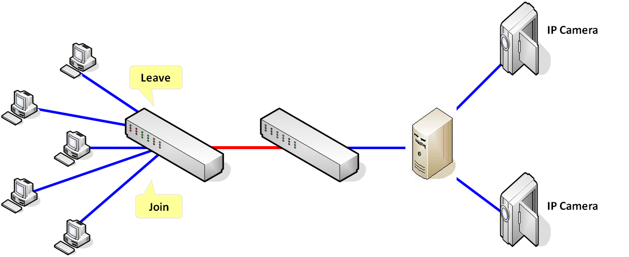 The figure shows that the IP camera captured video through the server and the switch will multicast the data to all subscribers. On the other hand, only the clients who join the multicast group could receive IGMP message from the server.