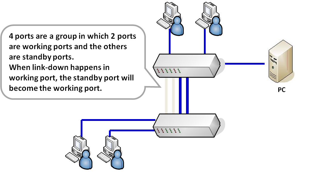 As the diagram shows, there are two switches group together with 4 ports. Two ports are working ports that will load-balance network trunk while the rest of two are standby ports, which will become working ports when working ports are link down.