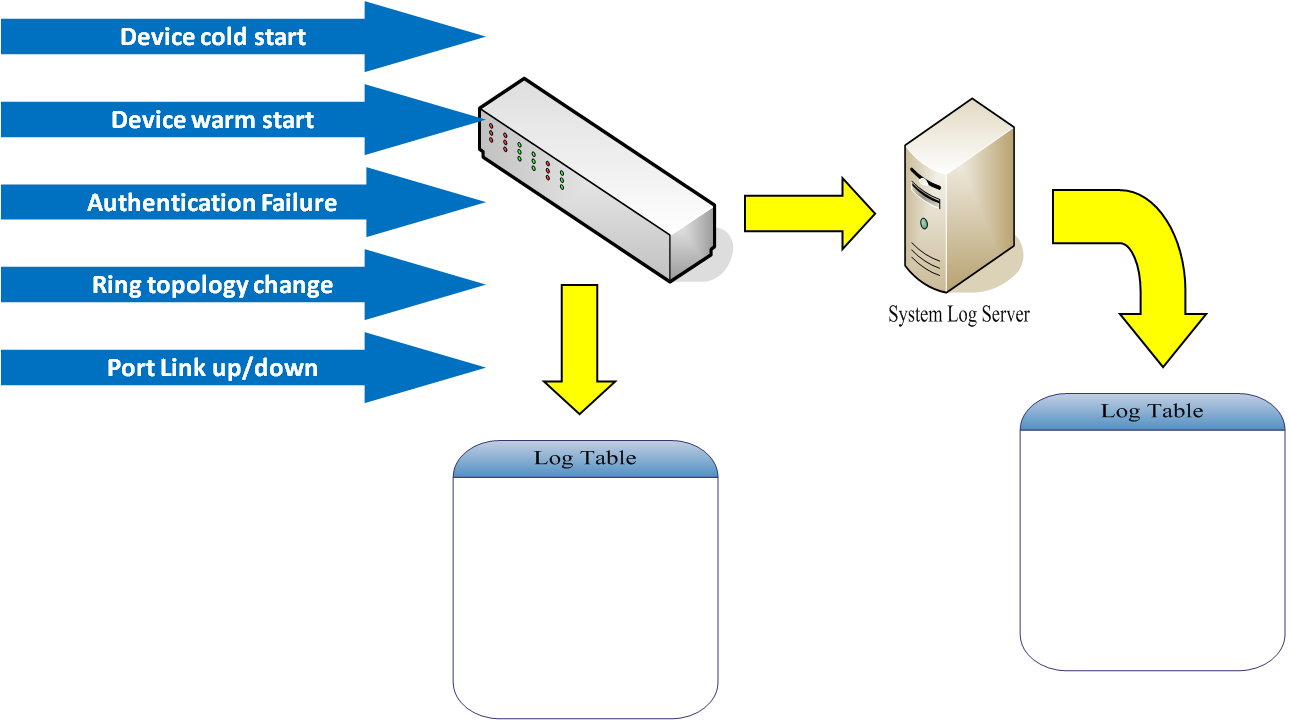 The diagram shows that when one of five events happened, it will be recorded in log table of client and system log server when Syslog mode is set as server/ client both.