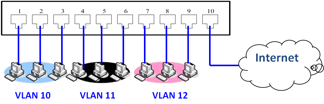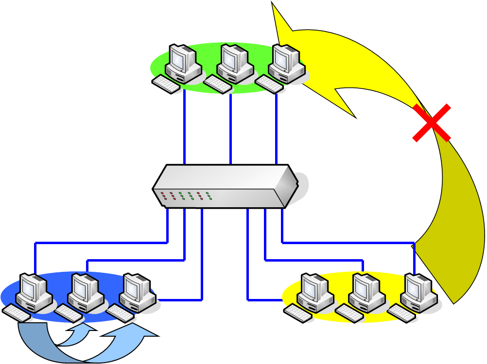 The diagram consists of three groups which connect to one switch. The members of yellow group could exchange data with each other, but couldn’t exchange data with the member of blue group or green group. This is the theorem of VLAN.