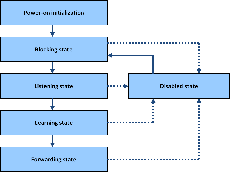 • Disabled - Not strictly part of STP, a network administrator can manually disable a port