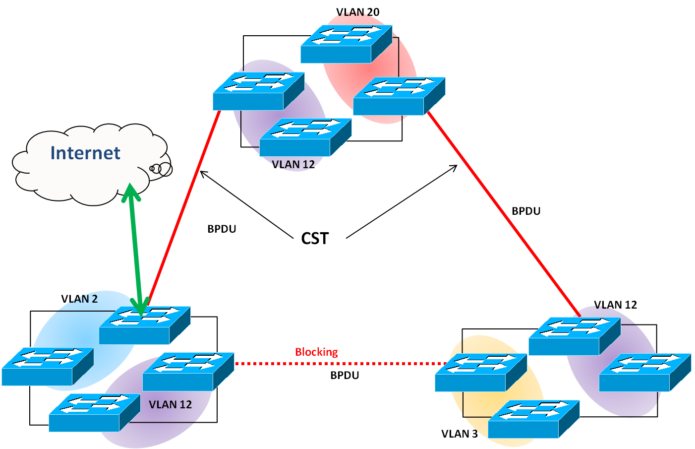 MSTP includes all of its spanning tree information in a single Bridge Protocol Data Unit (BPDU) format. Not only does this reduce the number of BPDUs required on a LAN to communicate spanning tree information for each VLAN, but it also ensures backward compatibility with RSTP (and in effect, classic STP too). MSTP does this by encoding additional region information after the standard RSTP BPDU as well as a number of MSTI messages (from 0 to 64 instances, although in practice many bridges support less). Each of these MSTI configuration messages conveys the spanning tree information for each instance. Each instance can be assigned a number of configured VLANs and frames (packets) assigned to these VLANs operate in this spanning tree instance whenever they are inside the MST region. In order to avoid conveying their entire VLAN to spanning tree mapping in each BPDU, bridges encode an MD5 digest of their VLAN to instance table in the MSTP BPDU. This digest is then used by other MSTP bridges, along with other administratively configured values, to determine if the neighboring bridge is in the same MST region as itself.