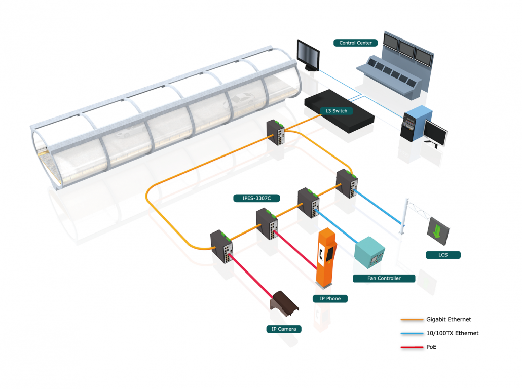 Undoubtedly, the operating environment of tunnel is harsh coping with humid with extreme temperature and pollutants in a tunnel generating by cars and other moving vehicles, the vibration caused by moving vehicles is another challenge for network devices. Thus, a reliable Ethernet network is the top priority for tunnel traffic monitor application.