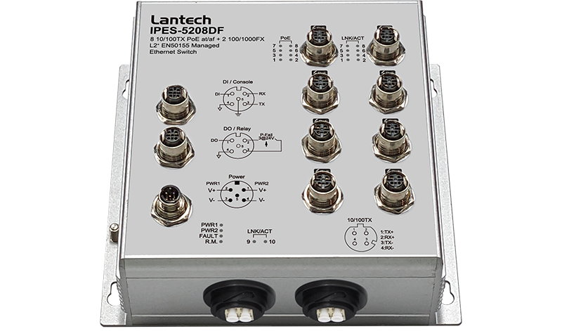 Lantech I(P)ES-5208DF (IP67/IP54) features high reliability and robustness coping with extensive EMI/RFI phenomenon, environmental vibration and shocks usually found in factory, substation, steel automation, aviation, mining and process control. It is the best solution for Automation, transportation, surveillance, Wireless backhaul, Semi-conductor factory and assembly lines.The I(P)ES-5208DF (IP67/IP54) is designed to meet with critical network environment with IP67/IP54 aluminum enclosure and M12 connectors for water proof. With EN45545-2 Fire & Smoke, and EN50155 & EN61373 verification, the I(P)ES-5208DF (IP67/IP54) is best for railway in train/track side, vehicle and mining applications. For more usage flexibilities, I(P)ES-5208DF (IP67/IP54) supports wide operating temperature from -40°C to 75°C.The I(P)ES-5208DF (IP67/IP54) also provides ±2000V EFT and±4000 VDC (Contact) / ±8000 VDC (Air) Ethernet ESD protection, which can reduce unstable situation caused by power line and Ethernet.