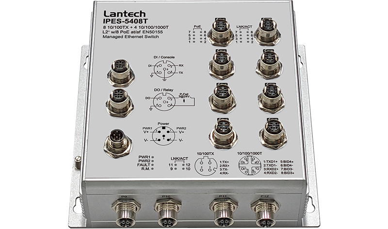Lantech I(P)ES-5408T (IP67/IP54) is a high performance L2+ (Gigabit uplink) Ethernet switch with 8 10/100TX(D-coded) + 4 10/100/1000T(X-coded) (w/8 PoE 802.3af/at ports by M12) provides L2 wire speed and advanced security function for network aggregation deployment. It delivers ITU G.8032 enhanced ring recovery less than 20ms in single ring while also supports train ring, enhanced mode, multiple VLAN mode with easy configuration. The comprehensive QoS, QoS by VLAN, advanced security including INGRESS/EGRESS ACL L2/L3, TACACS+**, SSH v2/SSL, Mac based DHCP server, DHCP Option 82, DHCP server, IGMPv1/v2/v3/router port, QinQ are supported and also required in large network. It also supports Cisco Discovery Protocol (CDP) for Ciscoworks to detect the switch info and show on L2 map topology.