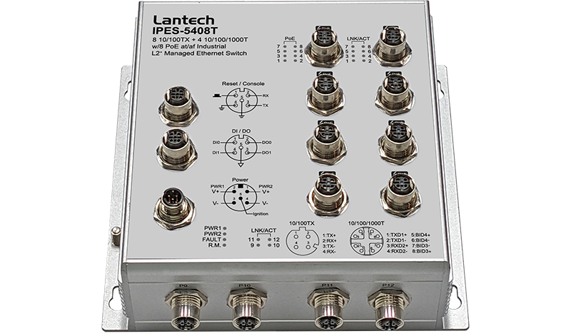 Lantech I(P)ES-5408T-X-IGN is a high performance L2+ Ethernet switch with 8 10/100TX + 4 10/100/1000T X-coded L2+ 8 PoE at/af Managed Ethernet Switch which by M12 connectors provides L2 wire speed and advanced security function for network aggregation deployment. It delivers ITU G.8032 enhanced ring recovery less than 20ms in single ring while also supports train ring, enhanced mode, multiple VLAN mode with easy configuration. The comprehensive QoS by VLAN, advanced security including INGRESS/EGRESS ACL L2/L3, TACACS+**, SSH v2/SSL and Mac based DHCP server, DHCP Option 82, DHCP server, IGMPv1/v2/v3/router port, QinQ are also supported and required in large network. It also supports Cisco Discovery Protocol (CDP) for Ciscoworks to detect the switch info and show on L2 map topology.