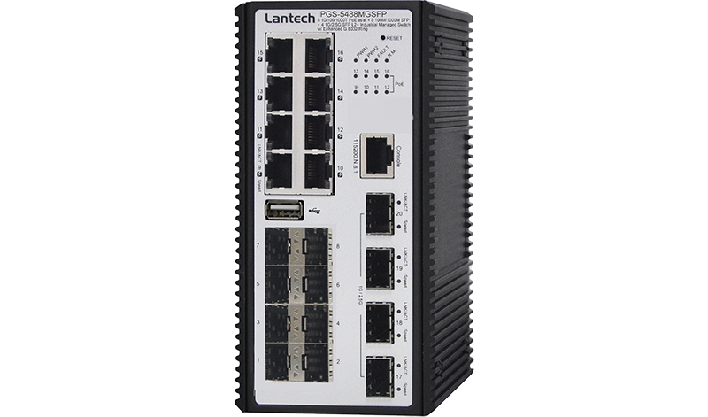Lantech I(P)GS-5488MGSFP is a high performance L2+ (All Gigabit) Ethernet switch with 8 10/100/1000T + 8 100M/1G SFP + 4 1G/2.5G SFP auto-sensing cage w/8 PoE 802.3 af/at ports which provides L2 wire speed and advanced security function for network aggregation deployment.