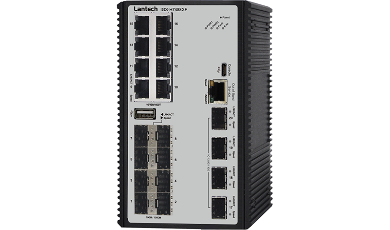 Lantech I(P)GS-H7488XF is a high-performance OS5 (All Gigabit) Ethernet switch with 8 100/1000T + 8 100M/1G SFP + 4 1G/2.5G/10G auto-sensing SFP+ (w/8 PoE 802.3af/at Ports) which provides advanced security function for network aggregation deployment. The OS5 platform supports L3/L2, IPv6/v4, NAT**, standardized ITU G.803 ring, IEC62443-4-2 certified cybersecurity, Macsec**, PTP v2** as well as ETBN TTDP** protocol suitable for the future-proof modern network.