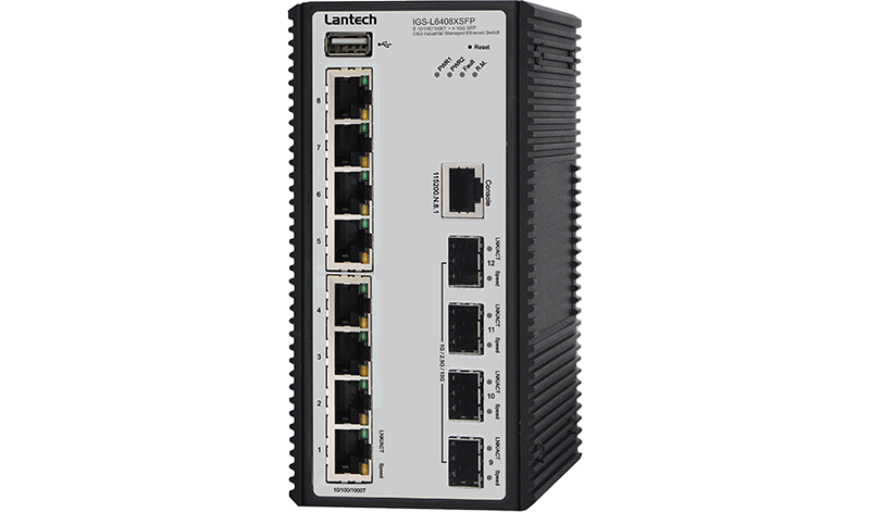 Lantech I(P)GS-L6408XSFP is a high performance OS3 Industrial Ethernet switch with 8 10/100/1000T + 4 1G/2.5G/10G auto sensing SFP+ (w/8 802.3at/af/bt PoE ports) which provides advanced security function for network aggregation deployment.