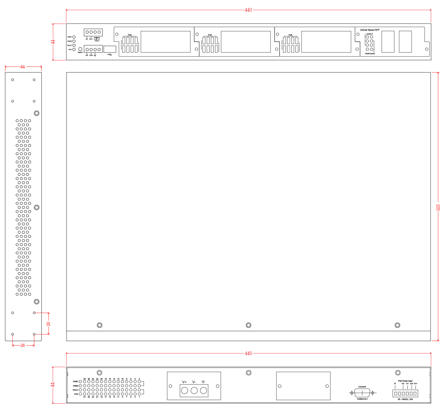 The user friendly UI, innovative auto topology drawing and topology demo makes IPES-3424DSFP-2P much easier to get hands-on. The IPES-3424DSFP-2P supports DMI interface that can correspond with DDM SFPs (Digital diagnostic monitor) to display the five parameters in Lantech’s UI, including optical output power, input power, temperature, laser bias current and transceiver supply voltage***. The TX power/RX power raw data is automatically converted to dB values for installer, making it easier to calculate the fiber distance. The complete CLI enables professional engineer to configure setting by command line.