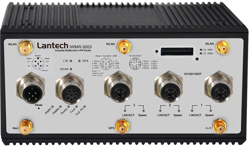 Lantech IWMR-3003 series is a next generation industrial multi-function VPN router w/up to 2x 802.11ac Wi-Fi + up to 2x LTE modem + 3 x Gigabit Ethernet (incl.1 PD) +4 serial ports (RJ45 model only) that supports advanced function of VPN, Load-Balancing, EMMC Flash Storage**, Protocol gateway(Modbus) , Wi-Fi roaming and LTE quad SIM fail-over for industrial applications. The dual core CPU with 1.6GHz + 256M flash enables the router to multi-task smoothly.