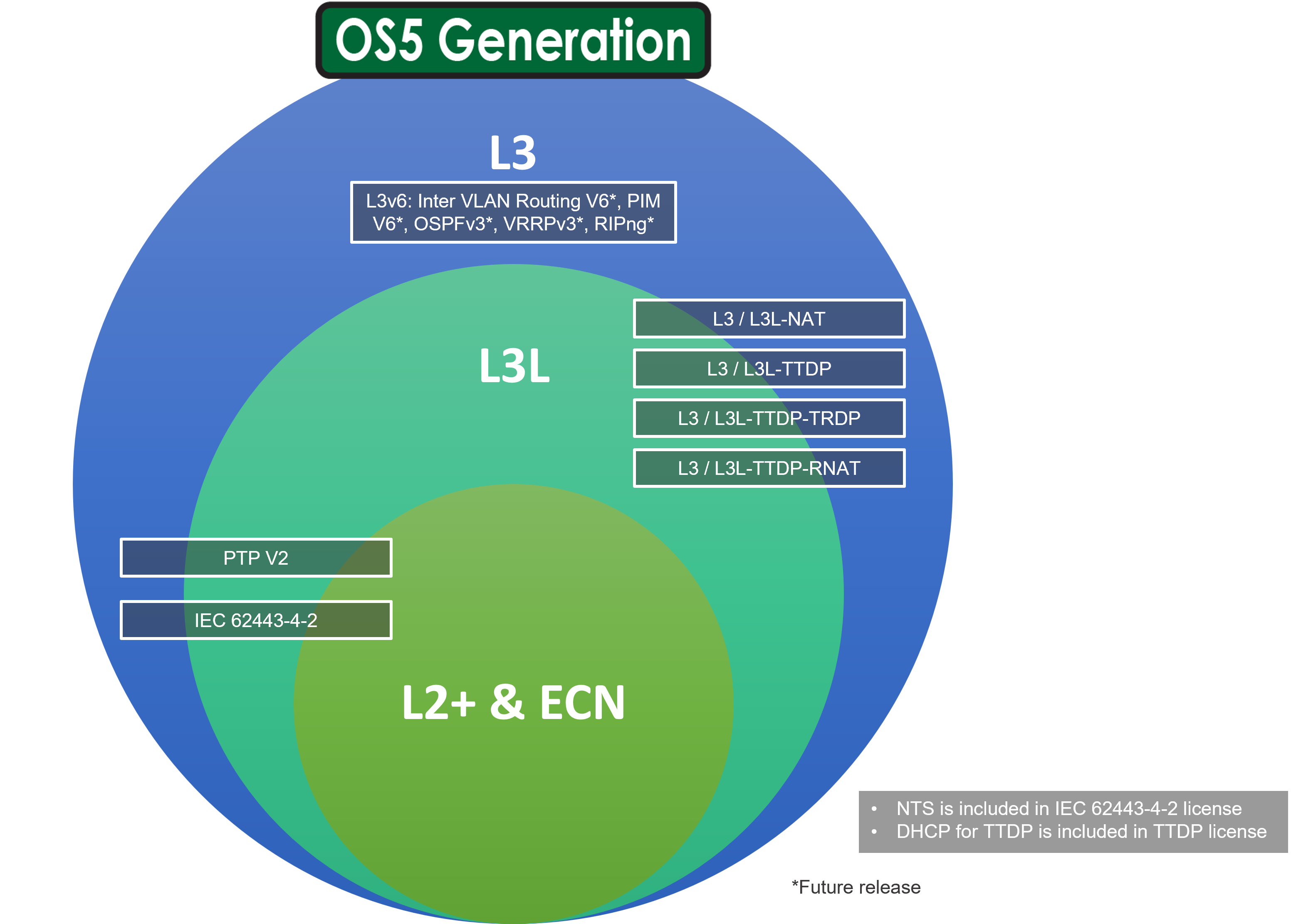 Advanced Layer 2 management functions with optional features of IEC 62443, Macsec, L3, L3 Lite, PTP, NAT, and IEC 61375-2-5 ETBN