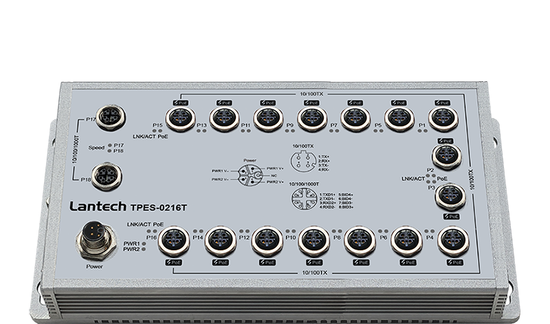 Lantech T(P)ES-0216T is an unmanaged Ethernet switch featuring 16 10/100 Base TX ports and 2 Gigabit copper ports with M12 connectors. Designed with an IP54 rated enclosure, it provides reliable protection against dust and water, meeting the stringent reliability requirements of industrial rolling stock applications.