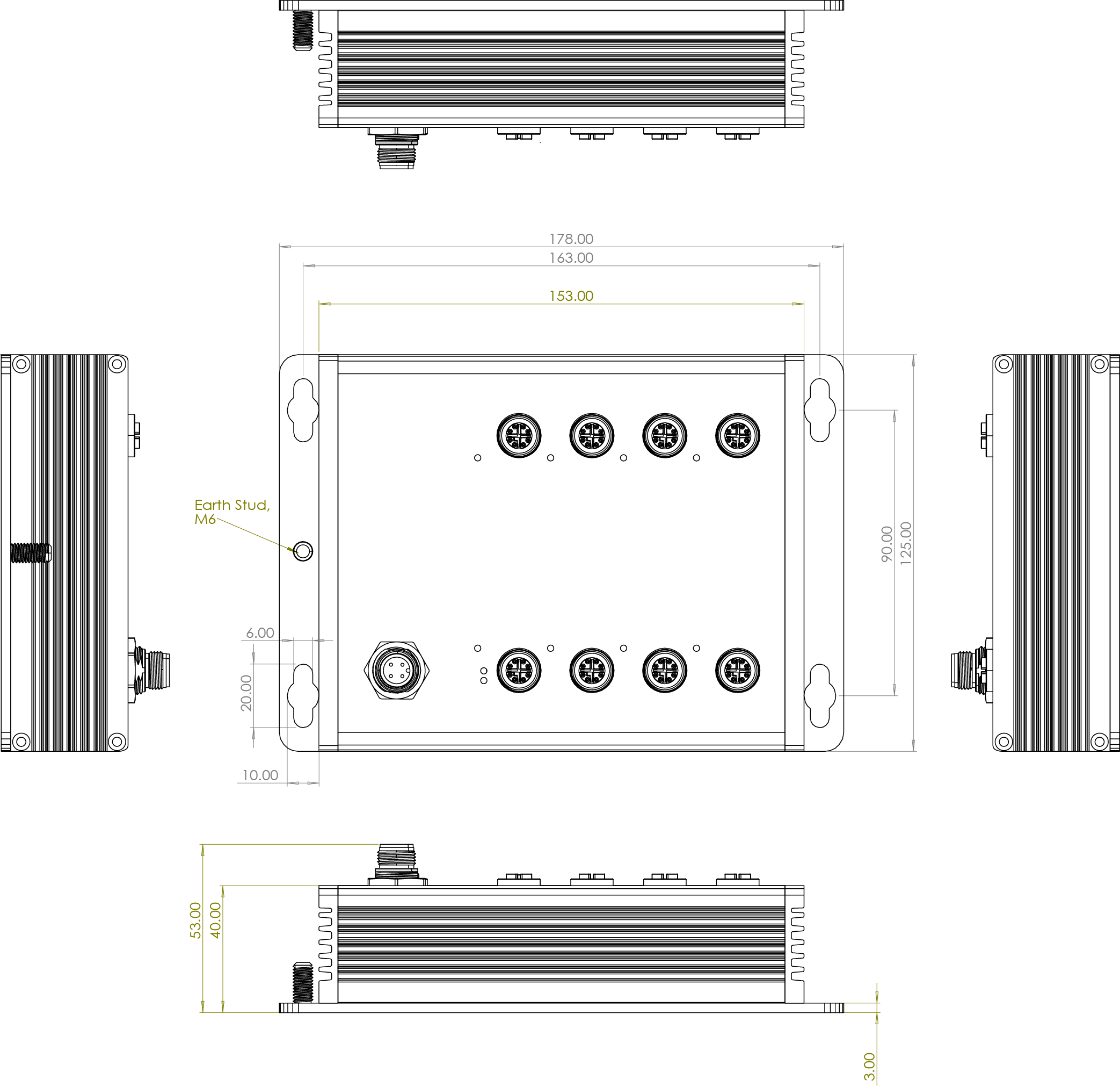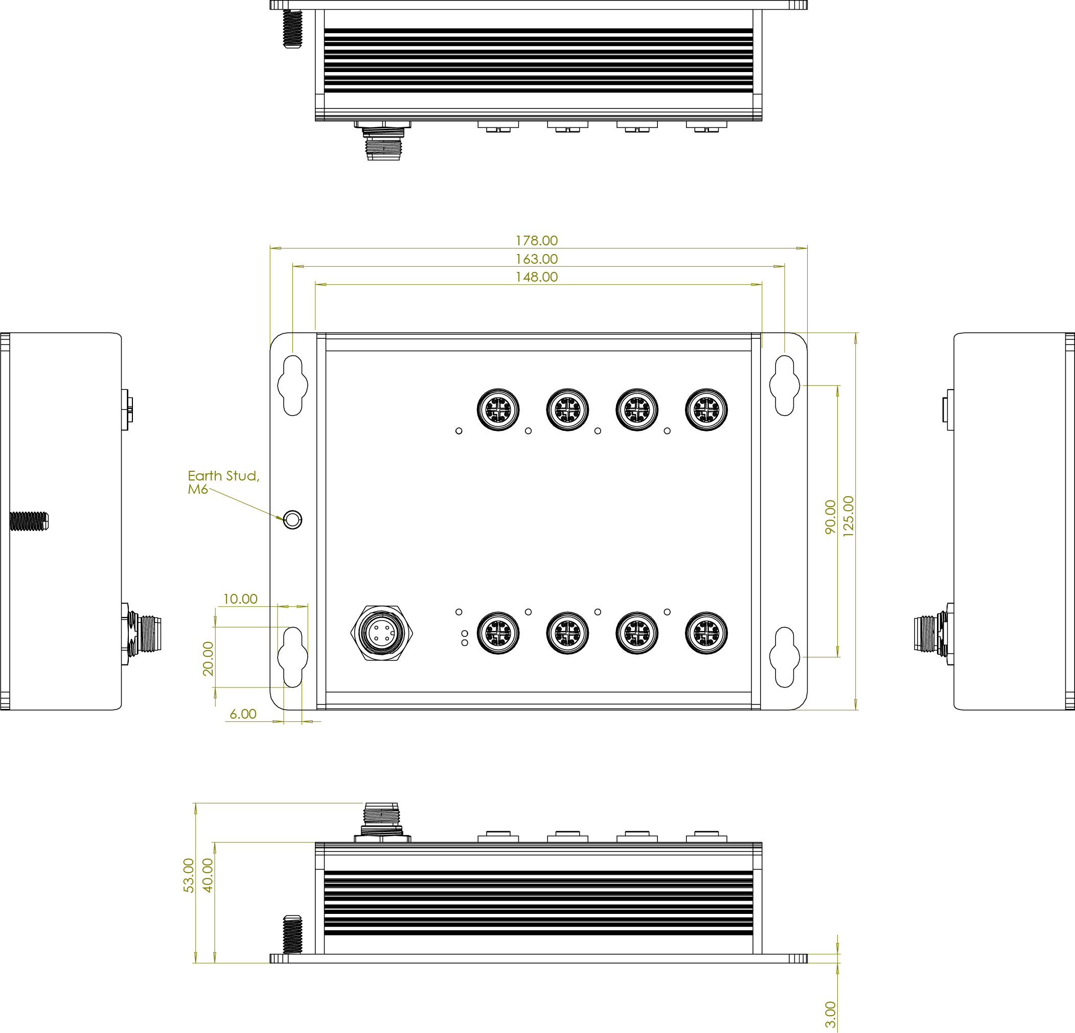 10/100/1000T: 8 x M12, 8-pole X-coded connector, Female with auto MDI/MDI-X function