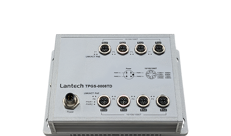 Lantech T(P)GS-0008TD is an 8-port 10/100/1000 Base-T unmanaged Ethernet switch featuring 8 PoE ports (802.3at/af, PoE model) and M12 connectors. Designed for industrial rolling stock applications, it offers IP67/IP54-rated protection to withstand harsh environments. Certified to EN50155, ITxPT, and E-marking*, ensuring compliance with world class standards for reliability and performance.