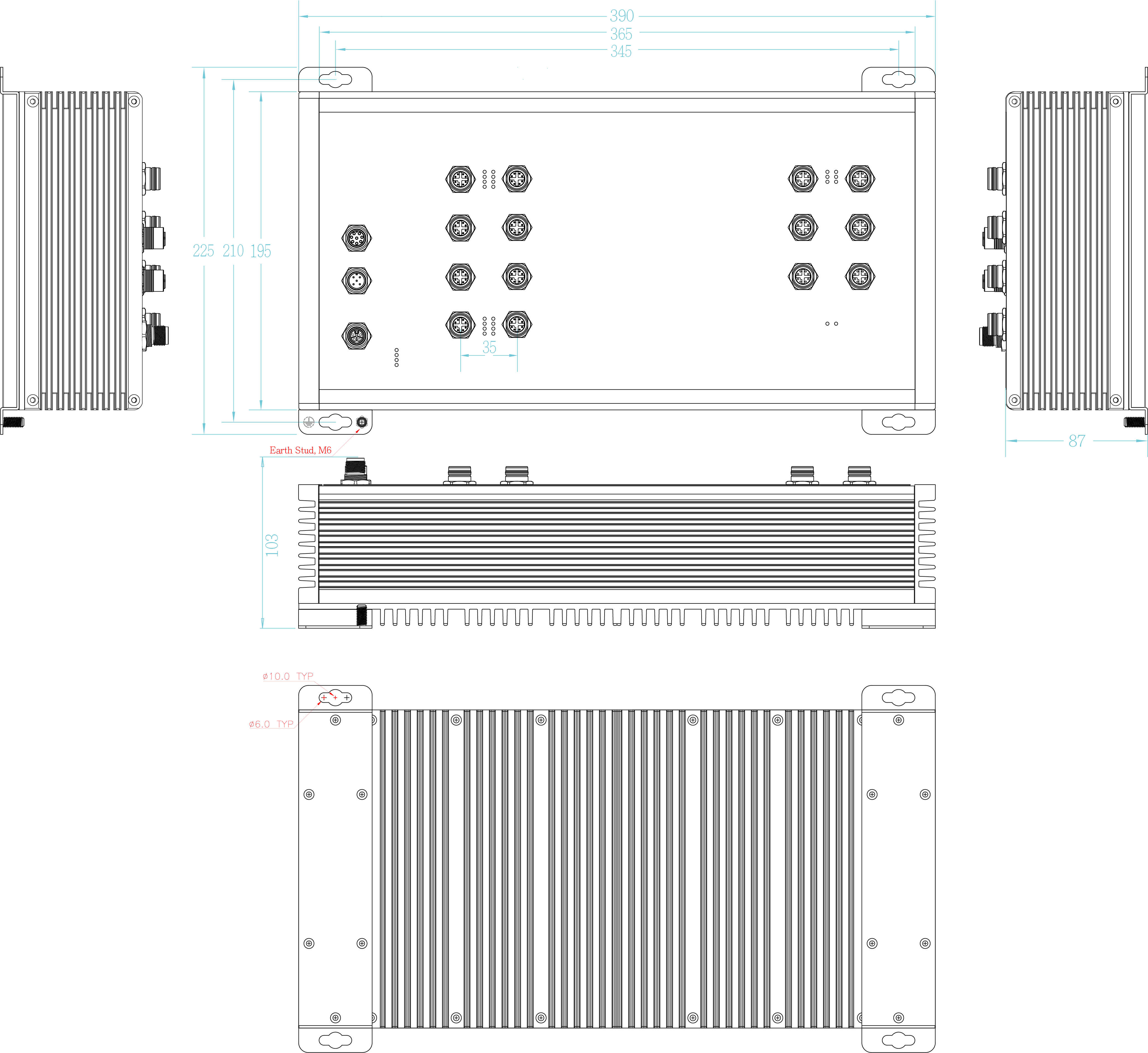 100M/1G/2.5G/5G/10G Copper: 6x M12 8-pole X-coded port 9-14 Push-Pull connectors