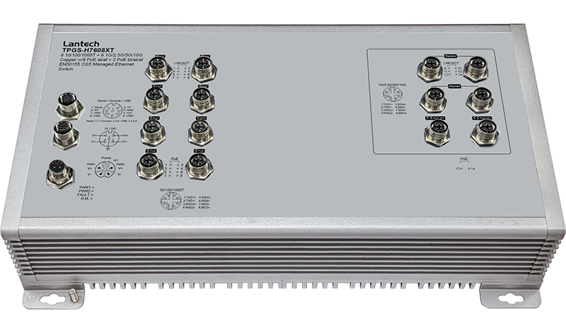 Lantech T(P)GS-H7608XT is a high-performance OS5 Ethernet security switch with 8 10/100/1000T + 6 100M/1G/2.5G/5G/10G Copper (PoE) switch (total 14 ports) w/ M12 X-coded Push-Pull lock connectors (EC 61076-2-101). The OS5 platform supports L3/L2, IPv6/v4, NAT**, standardized ITU G.803 ring, IEC62443-4-2 certified cybersecurity, SNMPv3, Macsec**, PTP v2** as well as ETBN TTDP**, TRDP* protocol suitable for the future-proof modern network.
